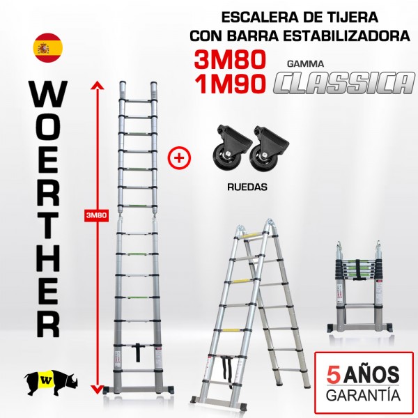 Escalera telescopica Woerther 3M80 + plataformaEsta escalera con barra estabilizadora de 3,80 m responde a mis necesidades. Ligera, robusta, ademas de tener un sistema de plegado ultra sencillo. Bastante rigida y solida. La barra estabilizadora aporta comodidad, ademas gracias a la barra estabilizadora uno se siente seguro usandola. Se guarda donde sea, casi imperceptible…