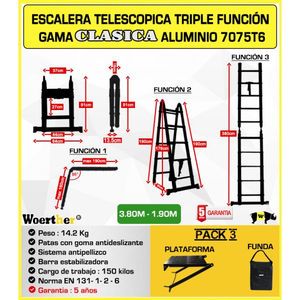 ESCALERA DE TIJERA TELESCOPICA Woerther 3m80 Triple función - PACK 3