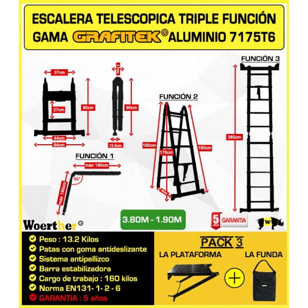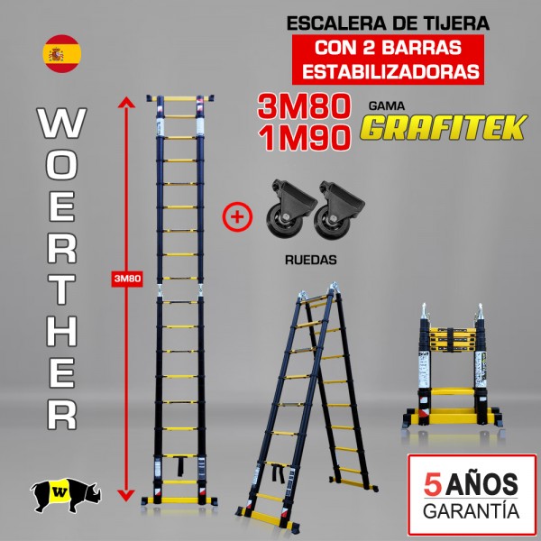 ESCALERA DE TIJERA TELESCOPICA GAMA GRAFITEK Woerther 3m80 Triple función CON 2 ESTABILIZADORAS - PACK 3