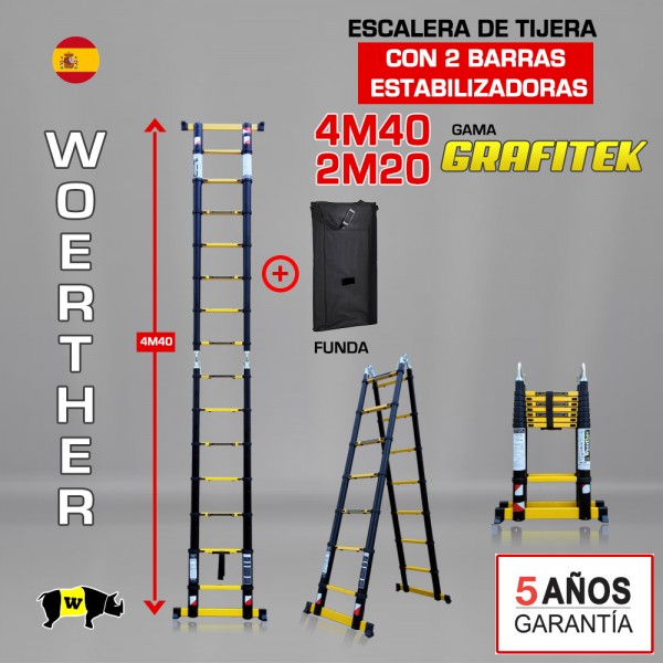 Escalera de tijera telescópica Woerther GRAFITEK 4,40m. Triple función - Pack 1