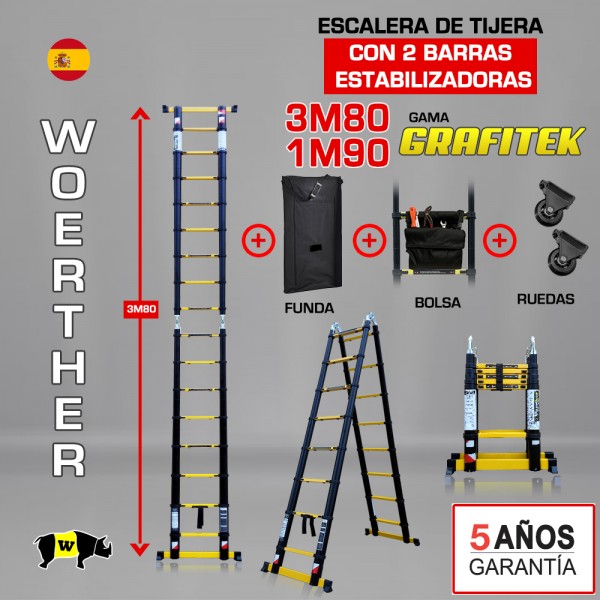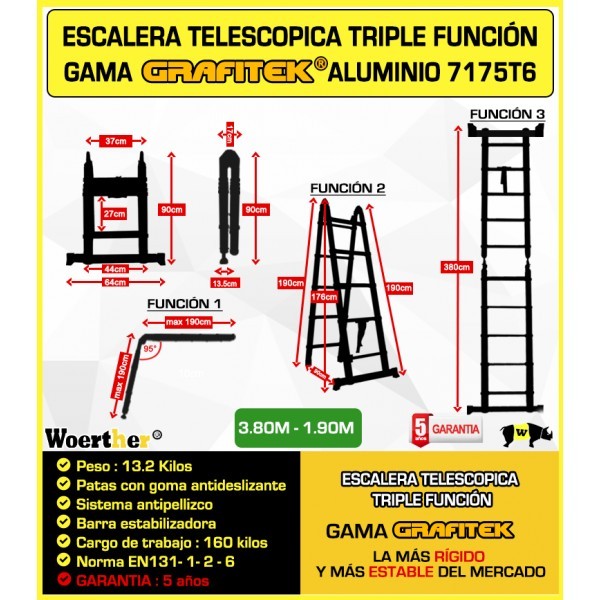 Escalera de tijera telescópica triple función: 3,80 m. 5 Años de garantía.