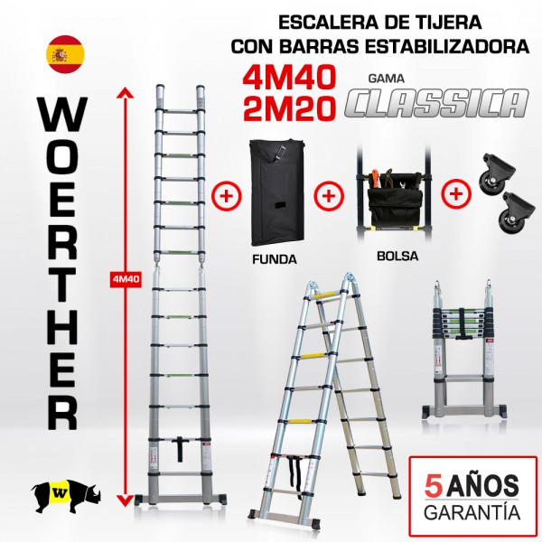 Escalera de tijera telescópica Woerther 4,40m. Triple función - Pack 5