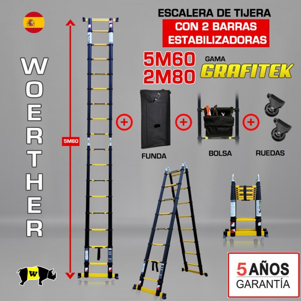 Escalera de tijera telescópica Woerther GRAFITEK 5m60 - Triple función - Pack 5