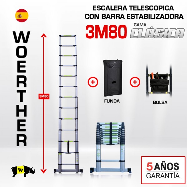 Como todos los productos Woerther, la escalera telescópica 3,80m con su barra estabilizadora tiene una garantía de 5 años.