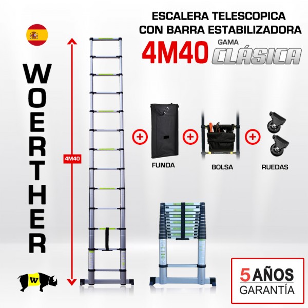 Como todos los productos Woerther, la escalera telescópica 3,80m con su barra estabilizadora tiene una garantía de 5 años.