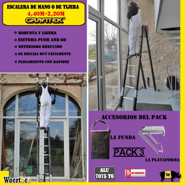 ¡Descubre el paquete completo de la escalera de tijera telescópica 4,40m con su funda y su plataforma- Woerther, para todos los trabajos, tanto para particulares como para profesionales!