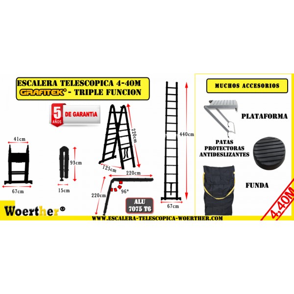Escalera de tijera telescópica triple función: 4,40m. 5 Años de garantía.