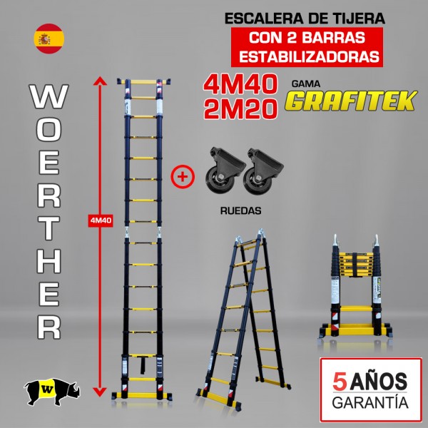 Escalera de tijera telescópica Woerther GRAFITEK 4,40m. Triple función - Pack 3
