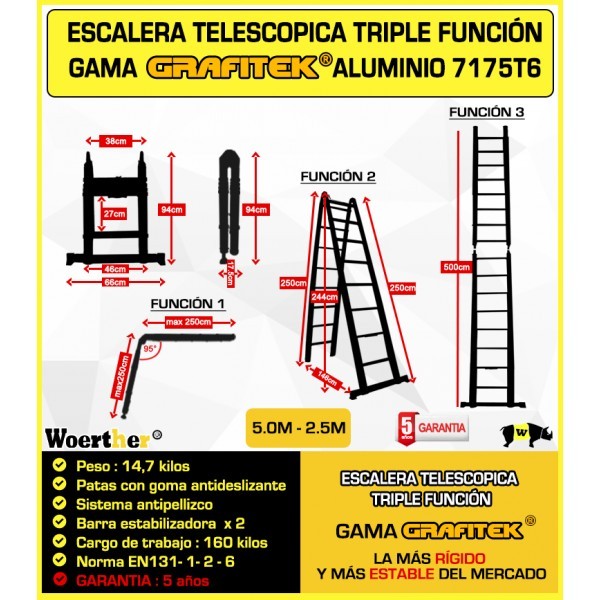 Escalera de tijera telescópica Woerther GRAFITEK 5m - Triple función - Pack 5