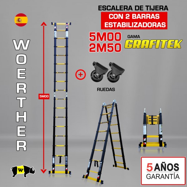 Escalera de tijera telescópica Woerther GRAFITEK 5m - Triple función - Pack 3
